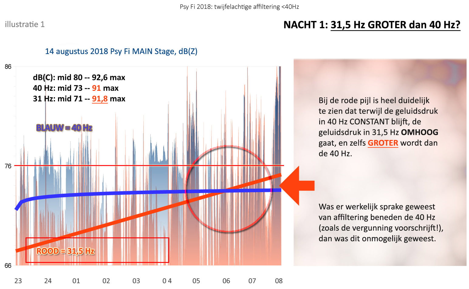 “Het lijkt er dus heel veel op dat Psy Fi simpelweg de bas opengooit. Dat is vreemd. Het was toch zo dat ze volgens de vergunning alles beneden de 40 Hz hadden moeten wegfilteren? We zullen het de komende nachten in de gaten houden.”
